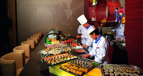 萬國料理西餐廳裝修時尚高雅,內(nèi)設(shè)鐵板燒餐區(qū)、壽司吧、鐵板燒貴賓房、法式貴賓房,是您請客、聚會、商談的理想之地。由從業(yè)超過廿年的西餐大師楊建國總廚主理,歐美餐點、法國私房菜、日本料理等一系列異國風(fēng)味令您如同置身于奇妙國度。